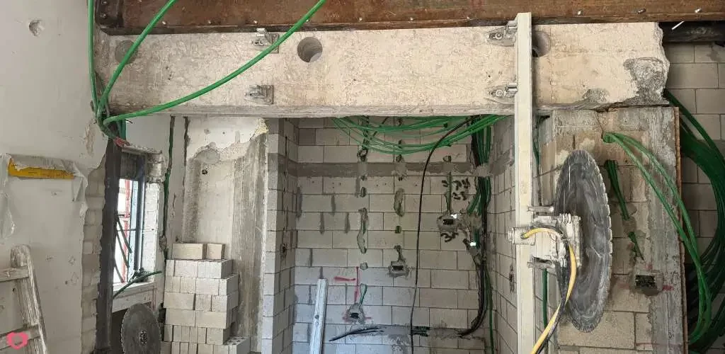 ניסור קירות, תקרות ורצפות בטון ליצירת פתחים לדלתות, חלונות ותשתיות שונות, תוך שימוש בדיסק יהלום לחיתוך מדויק ונקי.