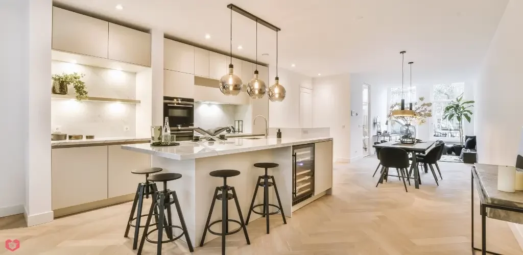 המטבח החדש עוצב בסגנון מודרני, עם ארונות בגוון שמנת, ידיות ברזל שחור, משטח עבודה משיש על האי במטבח עם תוספות כסאות בצבע שחור מט ומכשירי חשמל בילד-אין בגימור שחור. האי במרכז המטבח משמש גם לארוחות יומיומיות וגם כאזור עבודה, וכל תכנון התאורה חושב כך שידגיש את היופי והפונקציונליות.